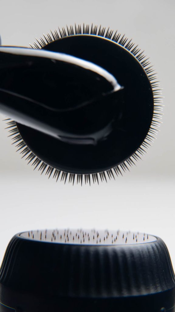 - Uses a stamp-style design versus rolling, meaning with each press you create vertical microchannels rather than dragging across the skin.