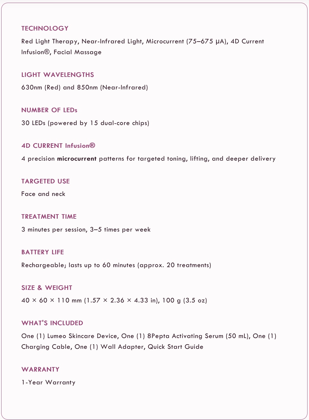 What makes the Lumeo special is the 4D Current Infusion® technology, which synchronizes these effects so your skin is being treated from multiple angles at once, not just one layer deep.