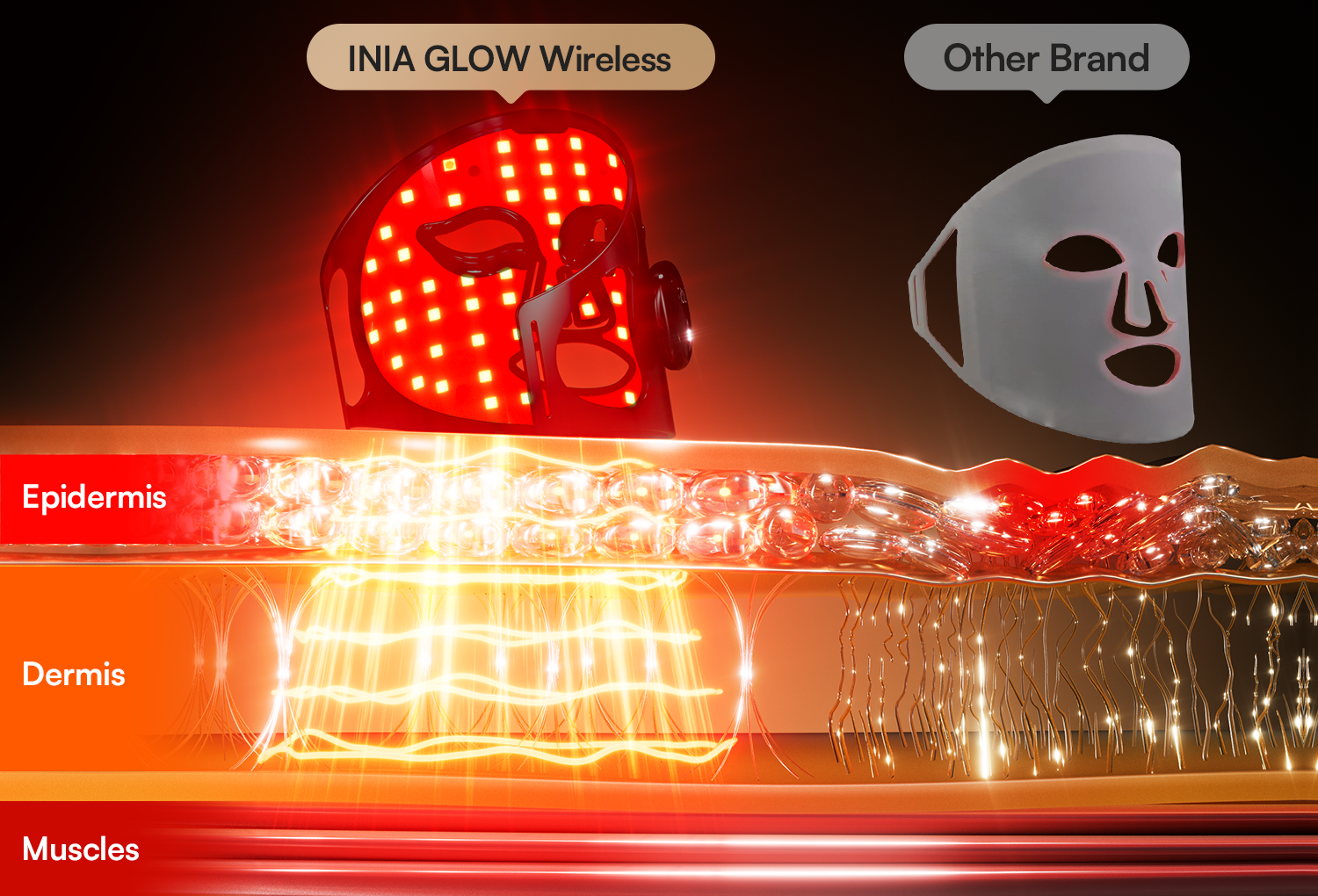 - Power + LED count: Many cheaper LED masks have fewer LEDs or lower energy output, which means less effective penetration. INIA offers both high LED count and high irradiance. (INIA)